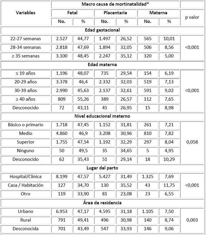 La asociación entre macro-causa tipo fetal fue significativa con edad gestacional, edad materna, lugar del parto y área de residencia. Para hipoxia intrauterina existe asociación con edad gestacional, edad materna y nivel educacional materno.