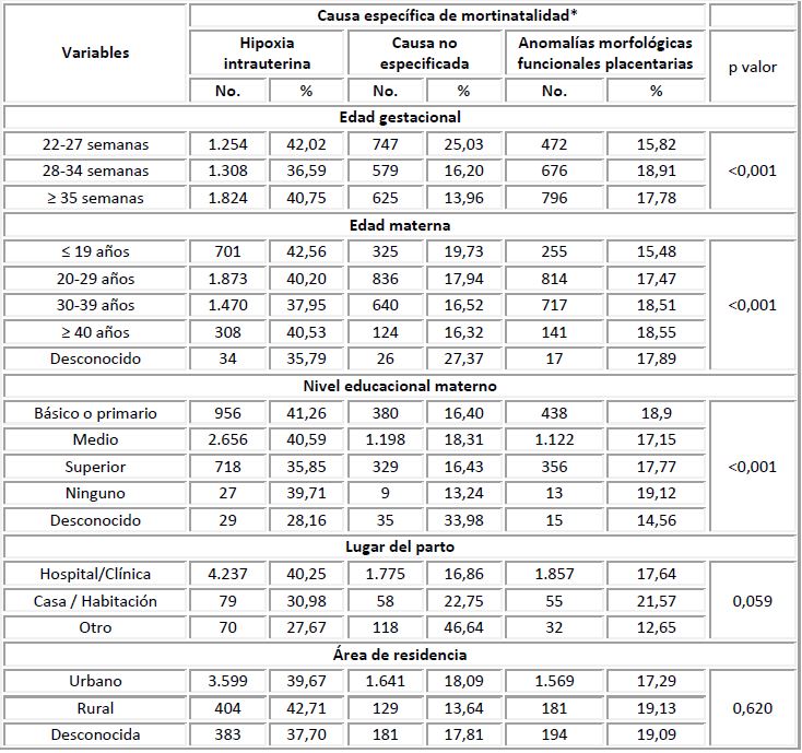 La causa específica hipoxia intrauterina se presenta más proporcionalmente en embarazos entre 22 y 27 semanas gestacionales, edad materna menor de 20 años, nivel educacional materno básico, parto en centro hospitalario y ruralidad. La causa no especificada se presenta más frecuentemente entre las 22 y 27 semanas gestacionales y urbanidad. La causa específica anomalías morfológicas-funcionales placentarias es más frecuente entre las 28 y 34 semanas gestacionales, edad materna mayor o igual a 40 años, parto en casa y ruralidad. (Tabla 3).
