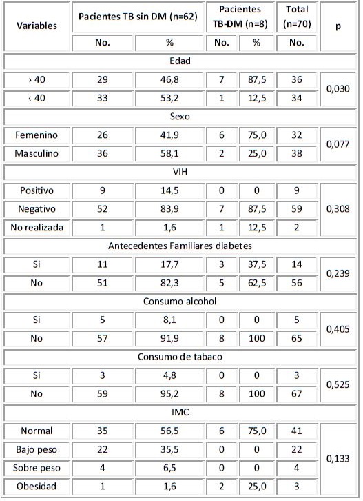 Results.: Of the 70 patients with Tuberculosis, 8 (11.4%) were diagnosed with DM. It was observed that the age> 40 years (p = 0.030) constitutes a risk factor for the TB-DM binomial; but there was no statistically significant difference with regard to sex, alcohol consumption, tobacco consumption, HIV, and body mass index (p> 0.05).