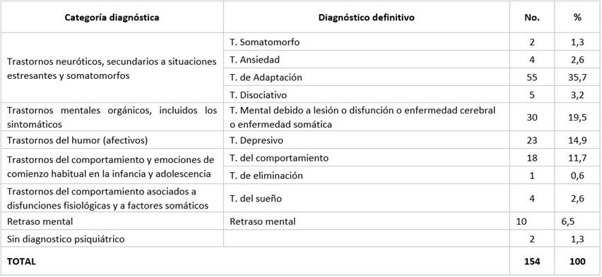 En relación con el diagnóstico realizado por psiquiatría, acorde con la Décima Edición de la Clasificación Internacional de Enfermedades (CIE-10), se pudo determinar que los trastornos neuróticos (secundarios a situaciones estresantes y somatomorfas) fueron los más frecuentes (42,8 %), y dentro de ellos, el trastorno adaptativo (35,7 %). Los trastornos mentales orgánicos, (19,5 %) fue la segunda categoría en frecuencia. Trastornos del comportamiento asociados a disfunciones fisiológicas y a factores somáticos y trastorno de eliminación (2.6 vs 0.6; respectivamente) fueron los menos representados. Es importante destacar que hubo 2 casos en los que no se estableció diagnóstico psiquiátrico alguno. (Tabla 1).