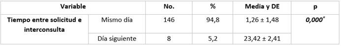 En otro sentido, al analizar el tiempo transcurrido entre la solicitud y el momento de la interconsulta, se pudo determinar que 146 (94,8 %) de las segundas, se realizaron el mismo día de su reclamo, resultó estadísticamente significativa la diferencia entre los valores de la media de estas en comparación a las solucionadas al día siguiente. (Tabla 2).