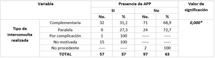 Además, nótese en esta misma tabla, que de manera significativa (α=0,000) las interconsultas complementarias y paralelas se realizaron mayormente con pacientes que no tenían antecedentes psiquiátricos personales (APP). Sin embargo, en 15 casos se solicitó la interconsulta solamente porque el paciente tenía algún APP, sin siquiera presentar manifestaciones psiquiátricas que ameritaran la evaluación por los especialistas. (Tabla 3).