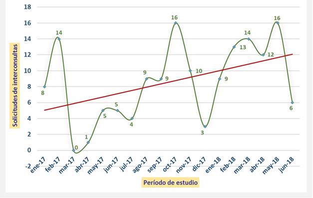 De acuerdo con el período de estudio, nótese en el figura 1, que la mayor frecuencia de solicitudes de interconsultas se recibió en los meses de febrero y octubre de 2017, y marzo y mayo de 2018 (14 vs 16 solicitudes, respectivamente para cada año); sin embargo, al analizarlo por semestres se observa un incremento sostenido de aproximadamente 18 o 19 solicitudes entre semestres (33 vs 51 vs 70).