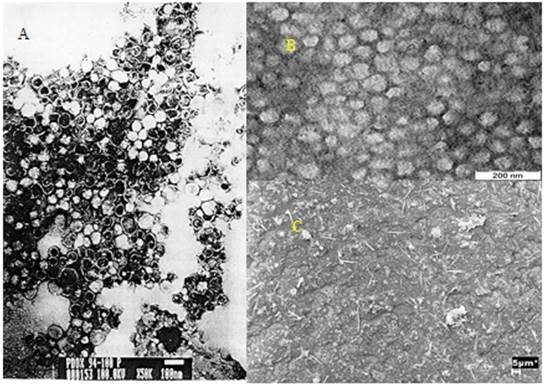 En la figura 1 A, se muestran los proteoliposomas originales, o VME-NMB, material de partida para obtener las formulaciones nanoparticuladas usadas en el presente trabajo, en B los proteoliposomas obtenidos y que son estructuralmente la base de estas dos formulaciones en estudio, y en C se muestran los cocleatos obtenidos a partir de dichos proteoliposomas.