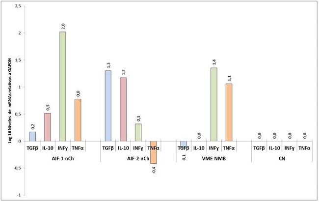 Las citoquinas pro-inflamatorias INFγ y TNFβ incrementaron su expresión en los grupos de animales tratados por vía nasal con AIF1nCh, y con Vesículas de Membrana Externa de Neisseria meningitidis B, usadas como control positivo por esta vía mucosal de inoculación. (VME-NMB). El incremento del ARNm de INFγ en el grupo tratado con AIF1nCh fue considerablemente mayor con respecto al inducido por las VME-NMB; la inducción de ARNm de TNFβ fue inducido al mismo nivel por estos dos tratamientos mientras que los niveles de ARNm de TGFβ e IL-10 son nulos en la VME y marginales en AIF1nCh. Cuando se administra AIF2nCh por la ruta IN, aumentan los niveles de ARNm de a IL-10 y el TGFβ, ambas son citoquinas que favorecen la activación de células T reguladoras (Tr). Esta formulación también ejerce una regulación negativa o disminución de la expresión del ARNm del TNFα.