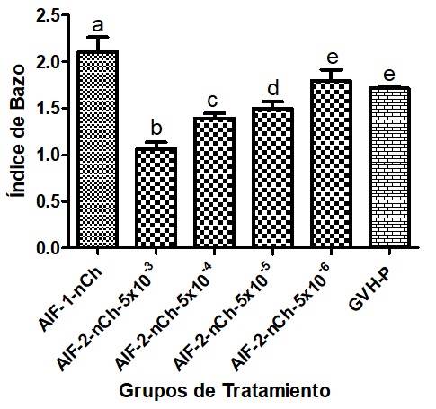 La figura 3 muestra gráficamente un resumen de los resultados; aparece en orden de izquierda a derecha el resultado del grupo tratado con la formulación proinflamatoria o inmunoestimulante, AIF1nCh. Las siguientes cuatro barras de la figura 3 indican los resultados de los tratamientos con la formulación supresora-reguladora, AIF2nCh, a cuatro dosis decrecientes con un factor de dilución de base 10 en escala logarítmica.