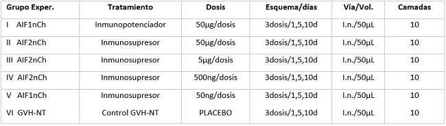 Sesenta camadas de ratones F1 de 10 días de nacidos fueron divididos en 6 grupos; cuatro grupos para el tratamiento inmunosupresivo con las 4 dosificaciones diferentes (40 camadas) y el grupo con tratamiento inmunoestimulador con una sola dosis (10 camadas) respectivamente y el grupo de los controles con una dosis (10 camadas). Todos los tratamientos se realizan sobre ratones a los cuales se les indujo la GVH-R. (Tabla 1)