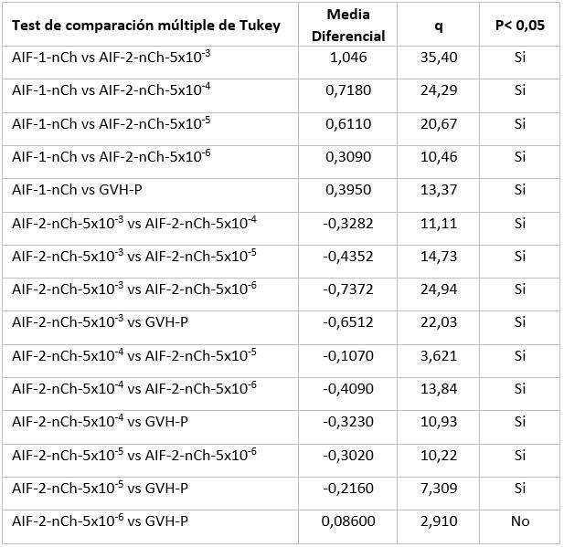 La formulación supresora, AIF2nCh, la probamos usando cuatro dosis distintas con un factor exponencial de dilución de una a otra. Con la dosis de 50 microgramos se alcanzó el mayor efecto de supresión de la EICH con un IB=1.1, y una diferencia significativa con el control no tratado o placebo, p=0.0002. Las siguientes dos dosis ensayadas (5 microgramos y 500 nanogramos) también suprimieron la EICH de manera dosis dependiente con IB=1,41 y 1,49, y con significación estadística, respectivamente; p=0,0002 y p=0.0003. La dosis más baja, 50ng, provocó un fenómeno contrario al esperado al provocar un aumento del IB=1,82, aumento visible y consistente, con respecto al grupo control placebo, pero no fue estadísticamente significativo, p>= 0,05.