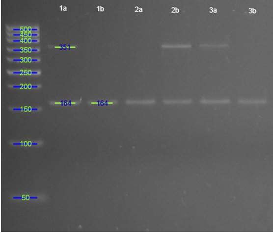 Se amplificó una secuencia de 351 pares de bases en un PCR de 25 ciclos (1º desnaturalización a 95° C por 15 min; 2º desnaturalización a 94° C por 45 s; 3º hibridación a 65° C por 45 s y elongación a 72° C por 45 s), que fue identificada en una electroforesis en geles de agarosa a 3 %.