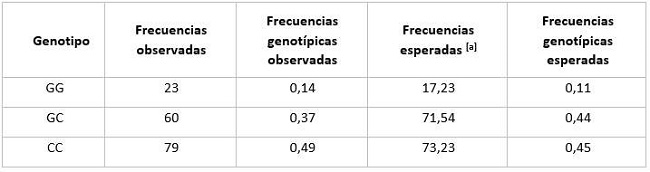 Al calcular el equilibrio de HW se obtuvo que el valor de p para el polimorfismo VEGF (+405G>C) fue igual a 0,04. Este valor (p<0,05) determinó el rechazo de la hipótesis nula, y se asumió que la población no se ajustaba al modelo de equilibrio de HW para el gen evaluado.