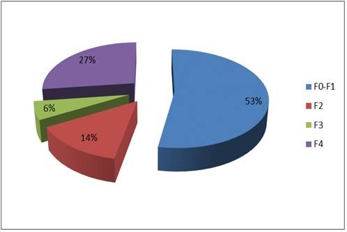 Se evaluaron 85 (87,6 %) pacientes por elastografía. En cuanto al grado de fibrosis hepática reflejan que 45 (52,9 %) pacientes evaluados se encontraba sin fibrosis o con fibrosis ligera (F0-F1), dentro de los pacientes con fibrosis, la categoría (F4) representativa de cirrosis hepática fue la de mayor frecuencia para un 27 %. (Figura 1).