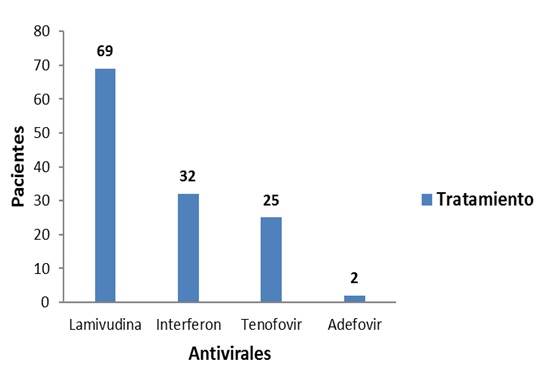 Un total de 83 (85,5 %) pacientes recibieron uno o más tratamientos antivirales, de ellos 53 (54,6 %) se mantienen bajo tratamiento actual. La lamivudina ha sido la más utilizada en 69 casos (71,1 %), seguido del interferón en 32 casos (32,9 %) (18 con interferón pegilado y 14 con interferón alfa 2b recombinante), el tenofovir en 25 casos (25,7 %) y el adefovir solo en 2 pacientes (2,1 %). (Figura 2).