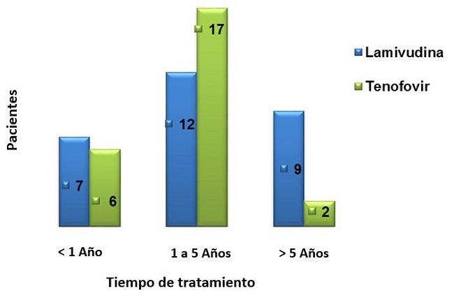 Vale destacar que del total de pacientes que llevan tratamiento con tenofovir, 19 (27,5 %) habían sido tratados previamente con lamivudina, dos de ellos además con adefovir y 8 con interferón pegilado, el cambio de terapia fue motivado por resistencias al tratamiento con lamivudina expresado clínica y virológicamente en diferentes momentos de su evolución, registrados en sus historias clínicas. En cuanto a la duración del tratamiento actual 12 pacientes, llevaban dos años de terapia, 5 un año y dos 3 años.