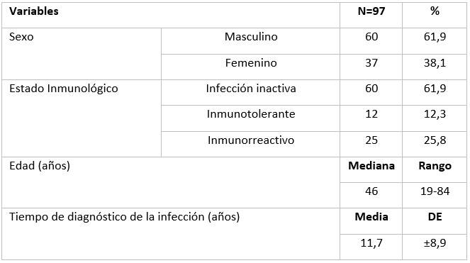La muestra de estudio estuvo integrada predominantemente por hombres, con un índice hombre/mujer de 1,6. La mediana de edad fue de 46 años y el tiempo promedio de diagnóstico de la infección fue de 11,7 años. Atendiendo al estado inmunológico, la mayor proporción de pacientes, 61,9 % se encontraban en fase inactiva, le sigue en orden de frecuencia los inmunorreactivos y por último, los que se encontraron en fase inmunotolerante, para un 25,8 % y 12,3 % respectivamente. (Tabla 1).