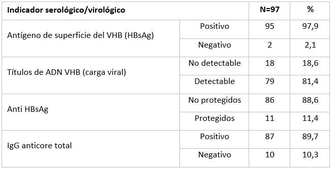 La mayoría de los infectados se encuentran en fase inactiva de su enfermedad sin evidencia significativa de fibrosis hepática y con niveles de viremia bajos, en su gran mayoría han recibido o reciben tratamiento antiviral con análogos de nucleótidos/sidos. Las características sociodemográficas no difieren de lo reportado en la literatura en esta área geográfica, predominio en el sexo masculino en edades inferiores a los 50 años.