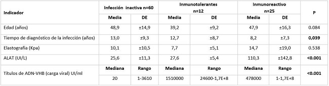 Las diferencias de medias entre los grupos de acuerdo con la fase inmunológica para la edad, tiempo de diagnóstico de la infección, elastografía y ALAT fueron realizadas mediante la prueba de Kruskal Wallis mientras que las diferencias entre los grupos para el ADN-VHB fueron calculadas mediante la prueba de medianas de muestra independientes.