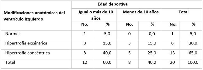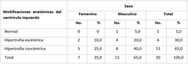En la tabla 1 se observa la posible relación entre las modificaciones anatómicas del ventrículo izquierdo y el sexo, del total de los deportistas evaluados, el 95 % mostró modificaciones anatómicas, mientras que solo 1 (5 %) mostró un corazón normal, se aprecia en relación con las modificaciones que predominaron la hipertrofia concéntrica del ventrículo izquierdo en un 65,0 %, en que un 25,0 % correspondió al sexo femenino y un 40,0 % al masculino, aunque se comprobó que estas modificaciones anatómicas del ventrículo izquierdo no se asociaron significativamente al sexo.