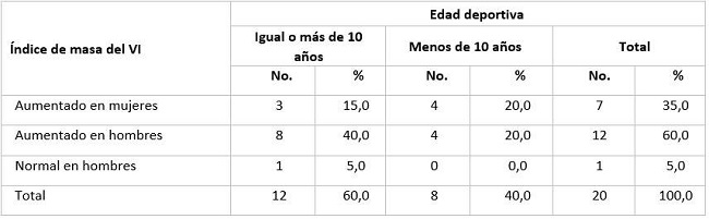 En la tabla 3 se observa que con una edad deportiva igual o más de 10 años predominó un aumento del índice de masa del VI en hombres en un 40%, mientras que con menos de 10 años no hubo diferencias en cuanto a la frecuencia de atletas de ambos sexos para un 20% respectivamente, se comprueba que el índice de masa del VI no se asoció significativamente con la edad deportiva.