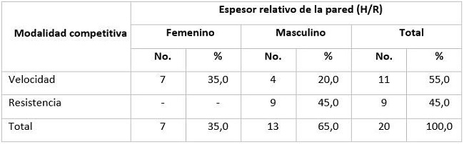 Al relacionar la modalidad competitiva con el espesor relativo de la pared (H/R) se observa que los deportistas que practican la modalidad de sprint tuvieron un mayor espesor relativo de la pared, lo que hace que predomine el grosor de la pared sobre el diámetro del ventrículo izquierdo y es lo que se espera encontrar en esta modalidad competitiva. Resulta interesante señalar que hubo una asociación significativa en este estudio entre la modalidad competitiva y el espesor relativo de la pared ventricular en el sexo femenino teniendo en cuenta que de las 7 mujeres que participaron en la modalidad competitiva de sprint tuvieron como promedio un espesor de 0,45 ± 0,07, y en los 4 hombres fue de 0,44 ± 0,06.
