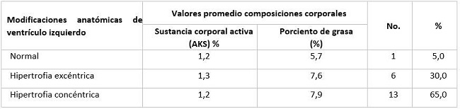 Al evaluar las modificaciones anatómicas del ventrículo izquierdo y relacionarlas con la composición corporal se obtuvo que no guardan relación; sin embargo hay que tener en cuenta que la muestra objeto de estudio es bastante homogénea en cuanto a composición corporal (porciento de grasa y sustancia corporal activa).