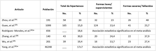 La tabla muestra el porcentaje de hipertensos en las diferentes series de COVID-19 revisadas, en base a su evolución. En esta se observa la clara relación entre este antecedente cardiovascular y el curso evolutivo desfavorable en pacientes con COVID-19, aunque en algunos de estas, esta relación no es tan clara o pudiera, a juicio de los autores del presente artículo, estar influenciada por otras covariables como la presencia de otras afecciones cardiovasculares de base, el hábito tabáquico, la DM y la edad, los cuales es conocido que se relacionan con ambas patologías.