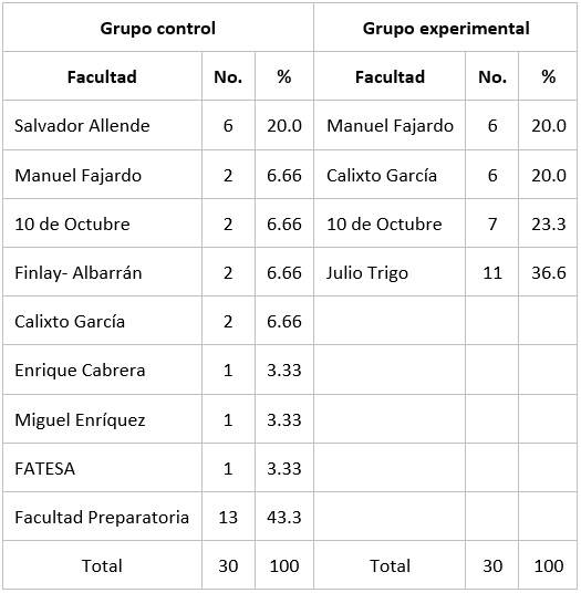 La muestra compuesta por 60 profesores de la UCM-H. Se trabajó con una muestra no probabilística, que obedece al criterio razonado de autoridades.7,8,9 Se escogieron 30 profesores para cada grupo: control y experimental.3