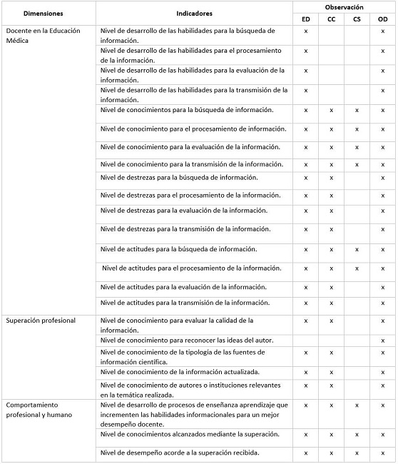 Se establecen tres dimensiones:3,6 función docente en la Educación Médica, la superación profesional y el comportamiento profesional y humano, con sus indicadores. (Tabla 2).