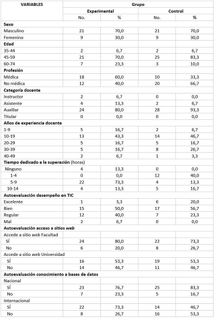 En ambos grupos se destaca la categoría docente Profesor Auxiliar con 80 % para los del experimental y 93,3 % para los del control. En los años de experiencia docente predominó en ambos grupos el intervalo de 10-19 años, al que pertenecen 43,3 y 46,7 % respectivamente, En relación con el tiempo dedicado a la superación, para el grupo experimental predominó el intervalo de 5-9 horas, al que pertenece 73,3 %, en tanto que en los controles correspondió al intervalo de 1-4 horas, con 40 %.