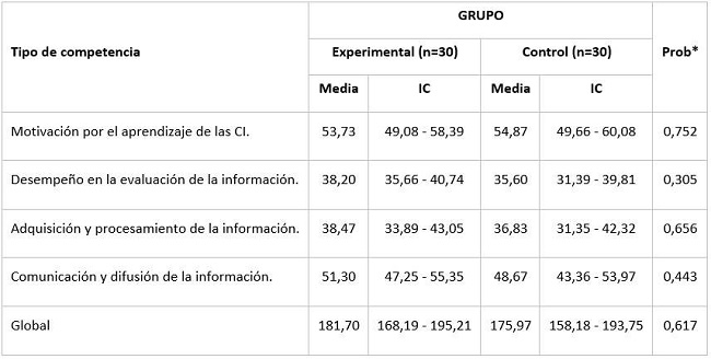 En ambos grupos, los valores medios de cada una de las competencias indagadas se encuentran por debajo del mínimo permitido (60 puntos), para ambos grupos la motivación por la búsqueda de información, con puntajes medios de 53,73 para el grupo experimental y 54,87 para el control y la comunicación y difusión de la información con 51,30 y 48,67 respectivamente, fueron las más próximas al punto de corte exigido.