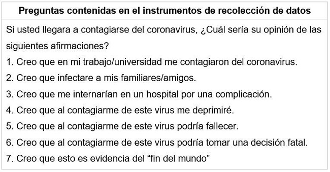 La investigación se basó en la aplicación de un cuestionario que mide la percepción o creencia de posibles situaciones después del contagio por COVID-19, a través de 7 ítems (figura 1). Todos tenían la posibilidad de 5 respuestas (muy en desacuerdo, en desacuerdo, indiferente, de acuerdo y muy de acuerdo). Fue validado en 5 pasos: Primero se consultó la literatura internacional, luego se tomó en cuenta la opinión de 30 expertos (infectólogos, internistas, intensivistas, epidemiólogos, entre otros). Posteriormente, se sometió a una comprobación estadística, en donde se evaluó la evidencia de validez y la cuantificación de la relevancia en casi 400 encuestados a nivel nacional; en este paso se observó una buena representatividad y claridad.13