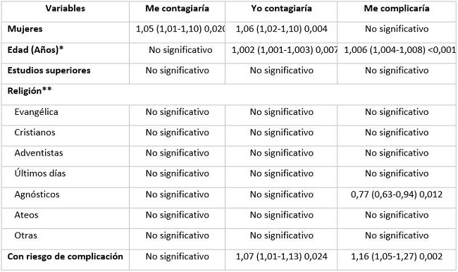 En los factores que se asocian en el modelo multivariado se encontró que las mujeres percibieron que se contagiarían en el trabajo/centro de estudios (valor p=0,020) o que luego ellas podían contagiar a sus familiares/amigos (p=0,004); a mayor edad hubo una mayor percepción de poder contagiar a sus familiares/amigos (p=0,007) o que se complicarían (p<0,001); los que tenían un riesgo para complicación por COVID-19 tuvieron una mayor percepción de poder contagiar a sus familiares/amigos (p=0,024) o que se complicarían (p=0,002); los agnósticos tuvieron una menor percepción de complicarse (p=0,012). (Tabla 1).