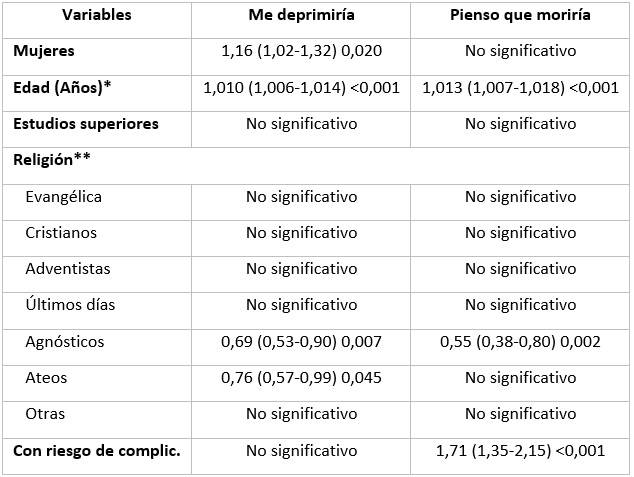 En otro modelo multivariado también se encontró que las mujeres perciben que se podrían deprimir si se contagian (valor p=0,020); a mayor edad hubo una mayor percepción de poder deprimirse (p<0,001) o que podrían morir (p<0,001); los que tenían un riesgo para complicación por COVID-19 tuvieron una mayor percepción de que podrían morir (p<0,001); los agnósticos tuvieron una menor percepción de deprimirse (p=0,007) o de que podrían morir (p=0,002); los ateos también tuvieron una menor percepción de deprimirse (p=0,045). (Tabla 2).