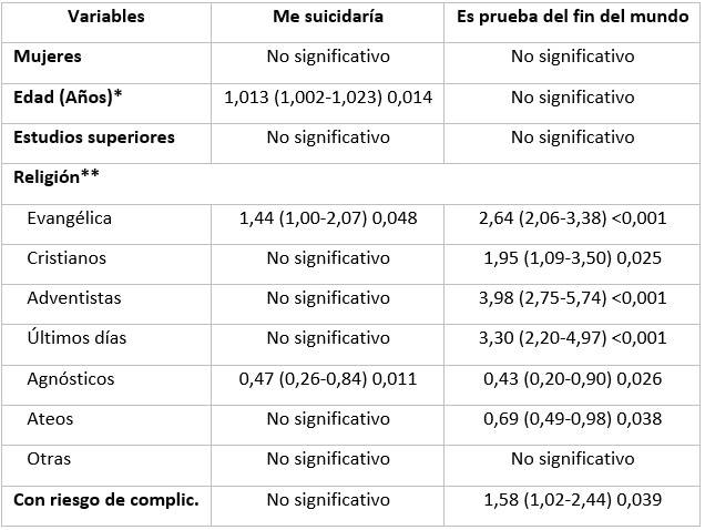 También se halló en el modelo multivariado con las dos preguntas finales que a mayor edad hubo una mayor percepción de tomar una decisión fatal si se infectaran (p=0,014); los que tenían un riesgo para complicación por COVID-19 tuvieron una mayor percepción de que esto es prueba del fin del mundo (p=0,039); pensar en suicidarse si se contagian fue mayor entre los evangélicos (p=0,048) pero menor entre los agnósticos (p=0,011); y percibir que esto es una prueba del fin del mundo fue mayor entre los evangélicos (p<0,001), los cristianos (p=0,025), los adventistas (p<0,001) y los de la Iglesia de los últimos días (p<0,001); pero fue menor entre los agnósticos (p=0,026) y los ateos (p=0,038). (Tabla 3).