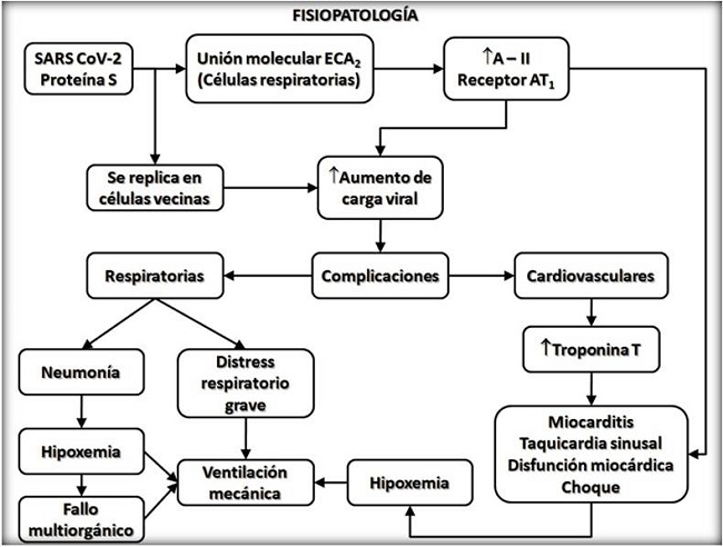 Dos estudios con microscopia electrónica demostraron la unión de la proteína S del virus con la proteína del receptor de la enzima convertidora de angiotensina II (ECA II) a nivel de la superficie de la célula respiratoria, que produce en el organismo una reacción inflamatoria sistémica y genera un desequilibrio del sistema renina angiotensina con aumento de la angiotensina−II (A−II) en correspondencia con la elevación de la carga viral.5,6,7