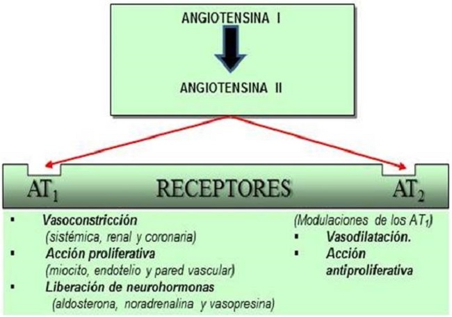 La A-II es una sustancia que regula la presión arterial y la homeostasis hidrosalina y está directamente relacionada con la génesis de la hipertensión arterial (HTA), la cardiopatía isquémica (CI), la insuficiencia cardíaca congestiva (ICC) y la insuficiencia renal (IR). La A-II actúa principalmente sobre los receptores AT1 y AT2 que están situados en los órganos diana y en la pared vascular. Estos receptores tienen efectos contrapuestos (Figura 2). En la HTA y en la ICC predominan las consecuencias de estimulación de los receptores AT1.