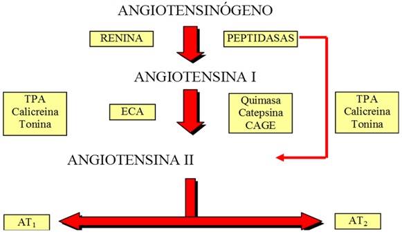 En la síntesis de la A-II se reconoce una vía clásica que es a través de la ECA II, mientras que hay otras vías de síntesis independiente de la ECA II y estas son capaces de convertir el Angiotensinógeno en A-II directamente, o en A-I y luego en A-II. (Figura 3).