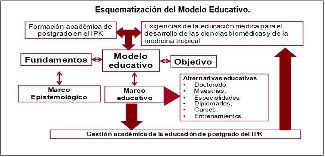 También el marco organizativo del Modelo Educativo para la formación académica de postgrado en el IPK tiene como objetivo general contribuir al desarrollo de la educación de postgrado y la superación profesional en el IPK, desde la organización académica y la evaluación institucional, en correspondencia con las necesidades de la educación médica para el desarrollo de las Ciencias Biomédicas y la medicina tropical. También el marco epistemológico está muy vinculado con los núcleos conformadores del modelo en sus partes. El modelo educativo para la formación académica de postgrado en el IPK, está conformado por el núcleo de la formación académica de postgrado, establecido desde la etapa de la preparación para el desempeño profesional de los especialistas que acceden a las diferentes formas de postgrado que se ofertan, como parte de la superación profesional (cursos, entrenamientos, talleres y otros) y los programas académicos de postgrado (residencia, especialidad, maestrías y doctorado). Estas dimensiones de la variable organización de la actividad de postgrado son las siguientes: Pertinencia social, tradición de la Institución y colaboración interinstitucional, profesores y tutores, aseguramiento didáctico, material y administrativo, estudiantes y currículo.
