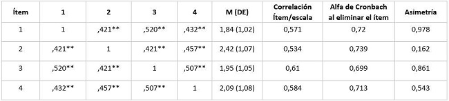 La matriz de correlaciones inter-elementos muestra que todos los ítems correlacionan entre ellos de manera significativa (p<,01). De la misma forma, se aprecia una correlación positiva de todos los ítems con la escala.