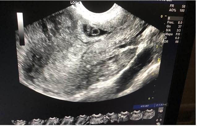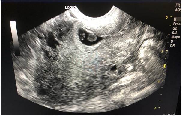 Otro antecedente ginecoobstétrico de interés estuvo dado por que la gestante acudió 19 días antes al servicio de emergencias por presentar dolor pélvico y sangrado vaginal; se establece un diagnóstico de ingreso de embarazo ectópico implantado en histerorrafia (corroborado mediante ecografía (Figura 1) en la que se visualiza saco gestacional regular con presencia de embrión de 6 semanas de gestación en su interior con latido cardíaco) más amenaza de aborto, se indicó maduración cervical, observación con revaloración e inicia tratamiento farmacológico con metotrexato (dos dosis) y cloruro de potasio. Cinco días después solicitó el alta voluntaria, pero reingresa ese mismo día con dolor abdominal en mesogastrio, los exámenes mostraron β-HCG en 13732, por lo que se decidió mantenerla en observación con antibióticoterapia, antes de proceder al alta con indicación de control en 8 días y nueva β-HCG.