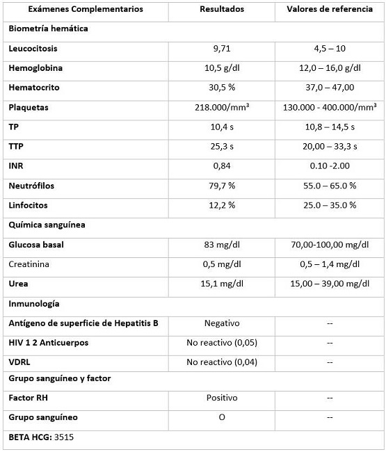 Ginecológicos y obstétricos: menarquia a los 13 años; ciclos menstruales regulares por 4 días sin dismenorrea; inicio de vida sexual a los 20 años; no refiere enfermedades de transmisión sexual; uso de anticonceptivos orales durante 5 meses; dos gestas; una cesárea; sin hijos vivos (el producto de la primera gesta tuvo cardiopatía congénita y falleció a los 8 días de nacida); 8,6 semanas de edad gestacional.