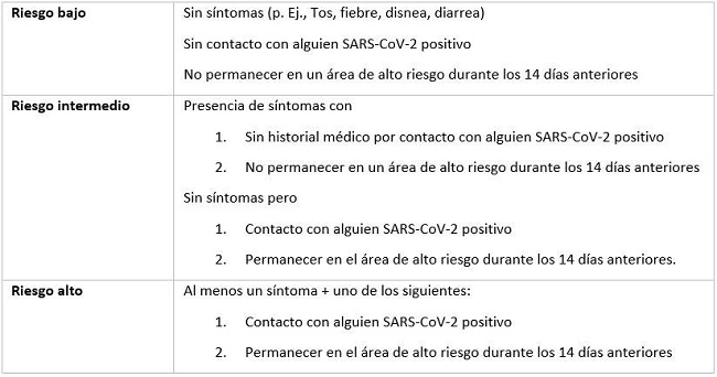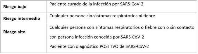 Repici A, et al.8 publicó que el riesgo de exposición del personal de endoscopia no se limita a estos procedimientos, sino que sugiere una posible transmisión fecal-oral tomando en consideración la detección reciente de SARS-CoV en muestras de biopsia y heces. Esto podría ser aún más relevante dado que la transmisión del virus puede ocurrir durante el período de incubación en pacientes asintomáticos; por tal razón recomienda evaluarlos de forma individual, según su posible riesgo de infección y los clasifica de la siguiente forma (Tabla 1):