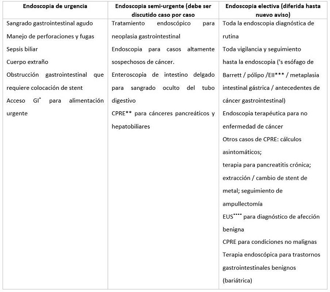 La sociedad interamericana de endoscopia (SIED) recomienda limitar la actividad endoscópica a aquellos casos que son urgentes. Revisar la actividad endoscópica programada de cada centro para decidir si puede diferirse o no. En este caso, alentar a la población a no llevar a cabo procedimientos electivos durante el brote activo.10