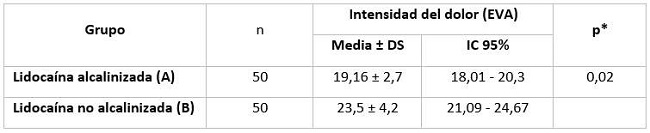 La intensidad del dolor por la inyección fue menor para la solución anestésica alcalinizada (Grupo A) con 19,16 ± 2,7 (IC95 %: 18,01-20,3) respecto al grupo que recibió la solución no alcalinizada (Grupo B) con 23,5 ± 4,2 (IC95 %: 21,09-24,67); y esta diferencia fue estadísticamente significativa (p=0,02). (Tabla 1).