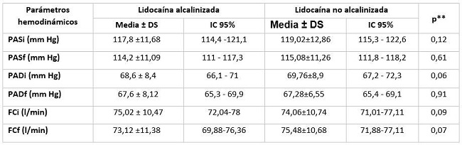 Results: There was a lower pain intensity due to injection in the alkalized lidocaine group (19.16 ± 2.7) compared to the non-alkalinized lidocaine group (22.88 ± 4.2); p=0.02. Likewise, the onset time of action was lower in the alkalized lidocaine group (105.72 ± 9.7) compared to the non-alkalinized lidocaine group (157.52 ± 12.1); p=0.002. However, no significant differences were found in the hemodynamic parameters (p>0.05) and the duration of the anesthetic effect (p=0.114).