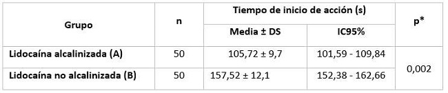 El tiempo de inicio de acción fue menor para la solución anestésica alcalinizada (Grupo A) con 105,72 ± 9,7s (IC95 %=101,59-109,84) respecto al grupo que recibió la solución no alcalinizada (Grupo B) con 157,52 ± 12,1s (IC95 %=152,38 - 162,66); p=0,002; (Tabla 3).