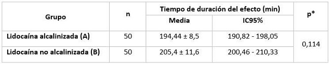 La duración del efecto anestésico fue menor para la solución anestésica alcalinizada (Grupo A) con 194,44 ± 8,5 min (IC95 %=190,82-208,74) respecto al grupo que recibió la solución no alcalinizada (Grupo B) con 205,4 ± 11,6 min (IC95 %=200,46 - 210,33); p=0,114 (Tabla 4).
