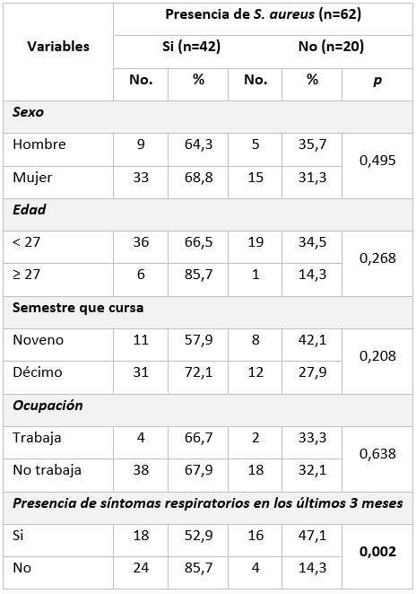 El 67,7 % de los estudiantes presentaron S. aureus. La frecuencia de S. aureus en hombres y mujeres superó el 60,0 %. De aquellos que arrojaron un resultado positivo para dicho microorganismo, el 85,7 % tenía 27 años o más, pertenecía a décimo semestre el 72,1 %, no trabajaba el 67,9 %; para las anteriores variables no se encontraron diferencias estadísticas significativas, p menor o igual a 0,05.