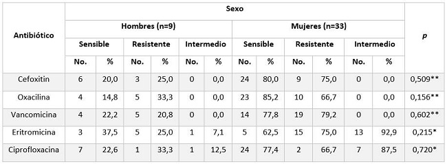 Al comparar la resistencia del S. aureus a los diferentes antibióticos entre hombres y mujeres, se observa que en los hombres se presenta en mayor proporción resistencia a cefoxitin (25,0 %), oxacilina (33,3 %) y ciprofloxacina (33,3 %); mientras que en las mujeres la resistencia se presentó en mayor proporción para la vancomicina (79,2 %) y eritromicina y cefoxitin (75,0 %) cada uno. Los anteriores resultados no presentaron diferencias estadísticamente significativas. (Tabla 2)