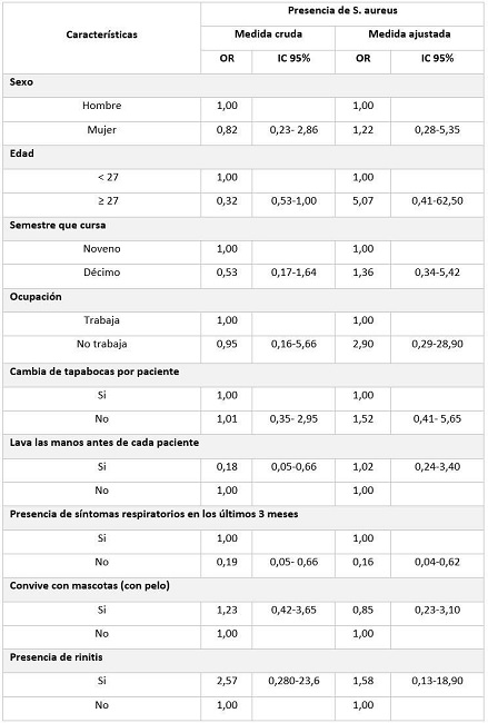 Como factores de riesgo están: ser mujer (OR 1,22 IC95 % 0,28-5,35), tener 27 años o más (OR 5,07 IC95 % 0,41-62,50), ser estudiante del décimo semestre (OR 1,36 IC95 % 0,34-5,42), no trabajar (OR 2,90 IC95 % 0,29-28,90), no cambiar de tapabocas por paciente (OR 1,52 IC95 % 0,41-5,65) y tener rinitis (OR 1,58 IC95 % 0,13-18,90), aunque dicha asociación no fue estadísticamente significativa.