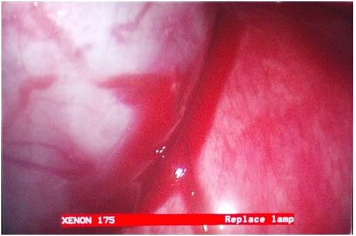Se ingresa con el diagnóstico de quiste de ovario izquierdo complicado. Se realiza intervención quirúrgica con abordaje por vía laparoscópica, encontrándose hemoperitoneo por quiste folicular roto, con sangrado activo a nivel de cara posterior de ovario izquierdo (Figura 1). Resto del anejo izquierdo normal, así como el útero, anejo derecho, apéndice cecal y resto de órganos intraabdominales. A través de un puerto accesorio de 5 mm en fosa ilíaca izquierda (FII) se aspiran 500 ml de sangre. Se realiza punción y aspiración de contenido hemático intrafolicular, desteche del folículo y hemostasia con electrocauterio.